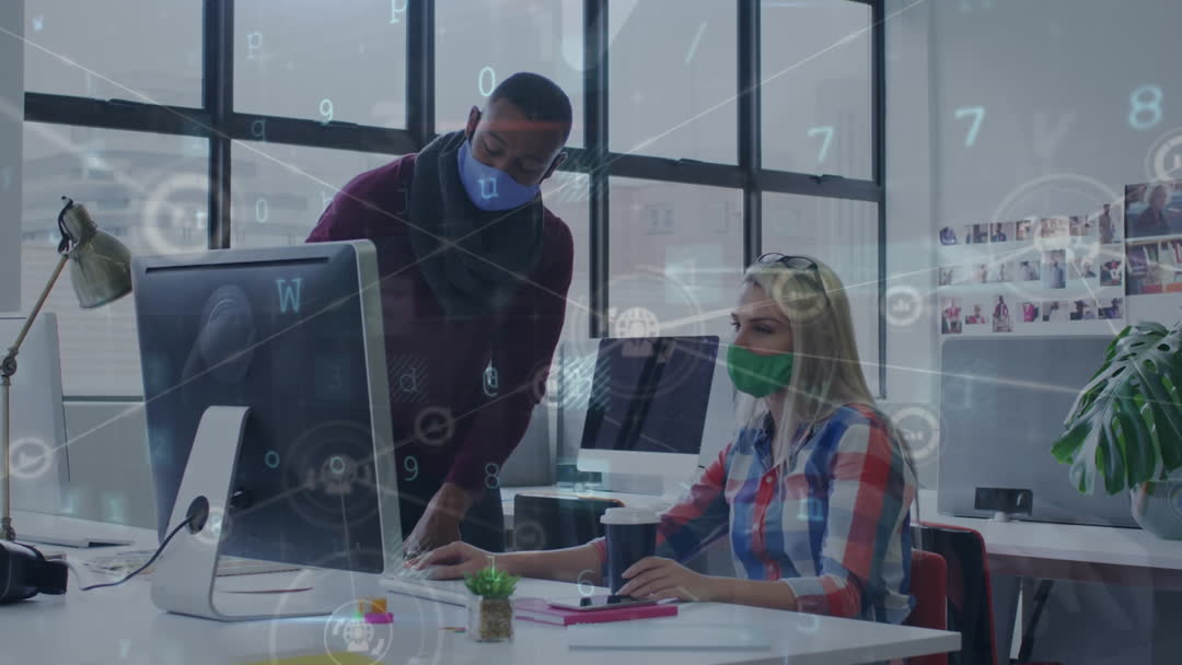 In an office, a man and woman wearing face masks work together. Digital overlays suggest high-tech digital networking. Suitable for themes related to modern business solutions, technology-driven workplaces, team collaboration, corporate safety, and adapting to future challenges.