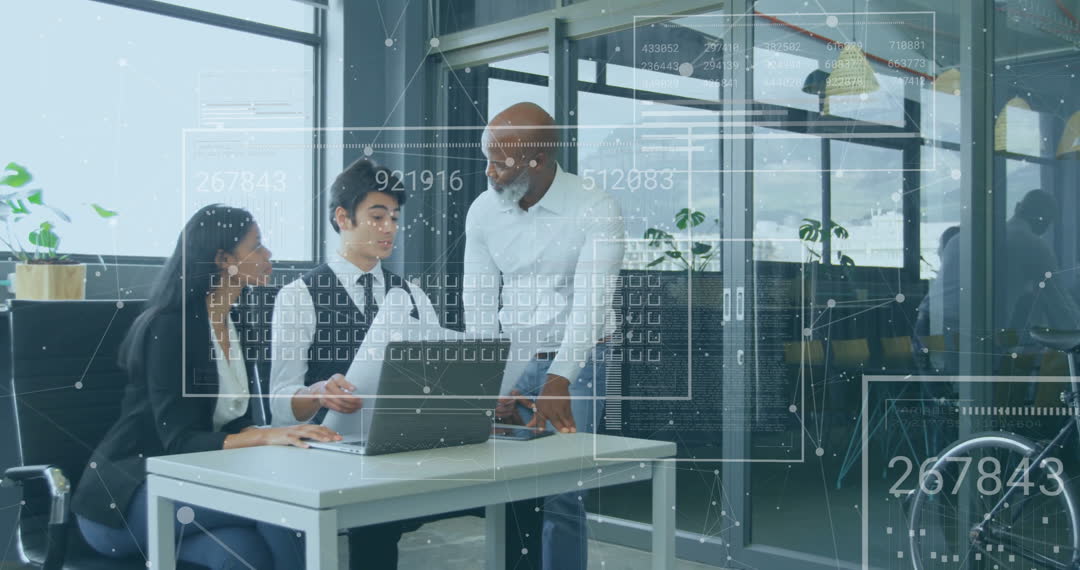 This video illustrates a diverse group of colleagues engaging in a discussion around a laptop in a modern office setting. The visual overlays of data and digital graphics symbolize engagement with technology and data-driven decision making. Ideal for use in topics related to teamwork, technology integration in business, innovative corporate environments, diversity in the workplace, and effective communication.