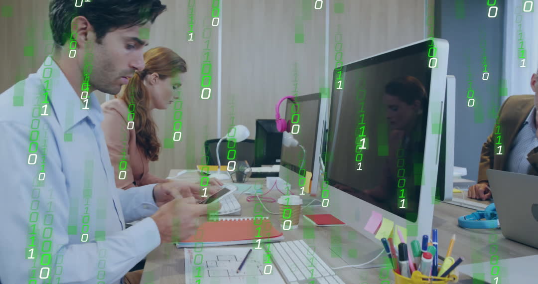 Group of diverse business professionals collaborating in a modern office environment with binary code overlay symbolizing data processing and technology integration. Ideal visual for illustrating the concept of digital transformation, teamwork in tech innovation, or an article about global finance. Use in an advertisement or brochure for IT services or a technology-startup.