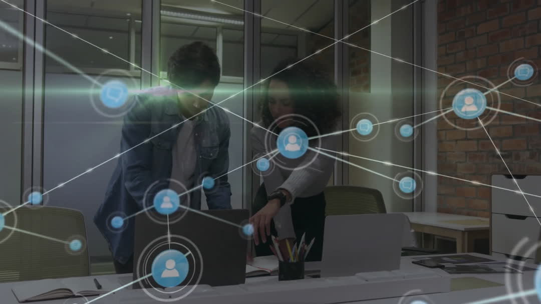 Diverse colleagues work together in a modern office climate, utilizing laptops and referencing a digital overlay of connections. The digital lines and nodes symbolize global business networks, collaboration, and technology in action. Ideal for illustrating concepts in team dynamics, business communication, innovative work environments, or high-tech operational strategies.