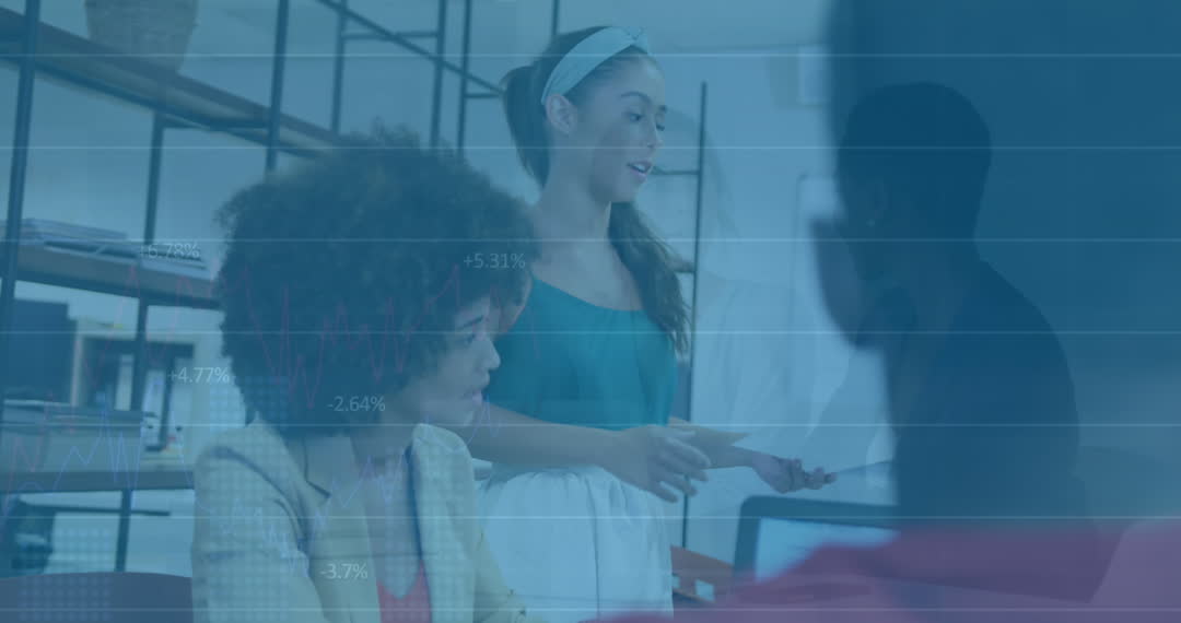 - Diverse Team Collaborating in Modern Office with Financial Graphs Overlay