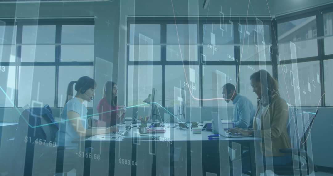 A diverse group of professionals engaged in a collaborative project within a sleek, contemporary office environment. The backdrop of digital and financial data overlay symbolizes global business operations and technology integration. This video is ideal for businesses seeking to promote inclusivity and technological advancement in corporate marketing materials, blog posts about modern workspaces, or websites focused on international business strategies.