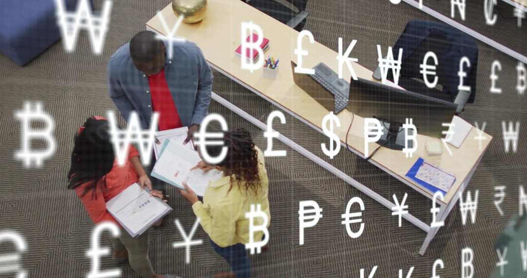 - Diverse Team Collaborating in Office with Currency Data Overlay