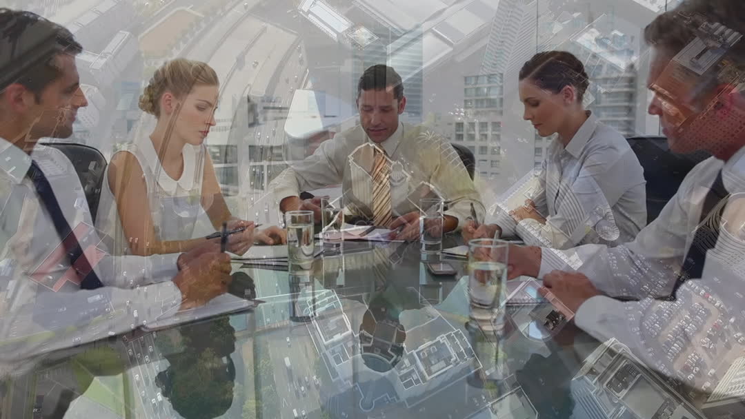 Diverse Team Collaborating on Business Strategy with Urban Overlay Video