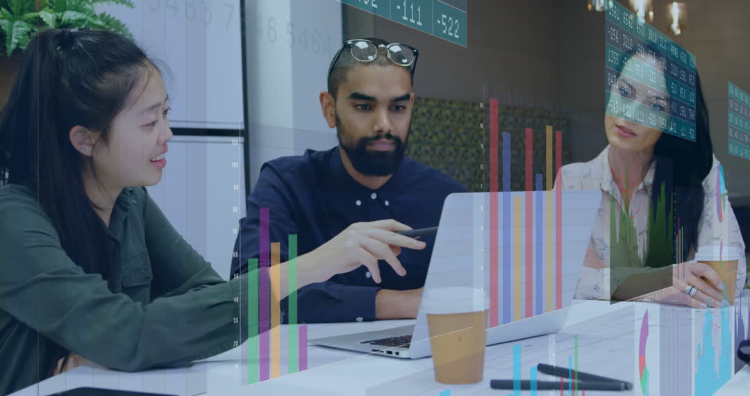 A diverse group of professionals actively discusses data analysis and business strategies using a laptop. Graphs and statistics overlay suggest a technological approach to problem-solving, making this perfect for illustrating concepts related to teamwork, digital transformation, and analytics in business presentations and reports.