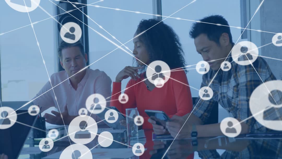 Three colleagues collaborate over business data with digital network icons symbolizing connectivity and communication. Suitable for illustrating themes of teamwork, modern technology in the workplace, digital transformation, and collaborative business environments.