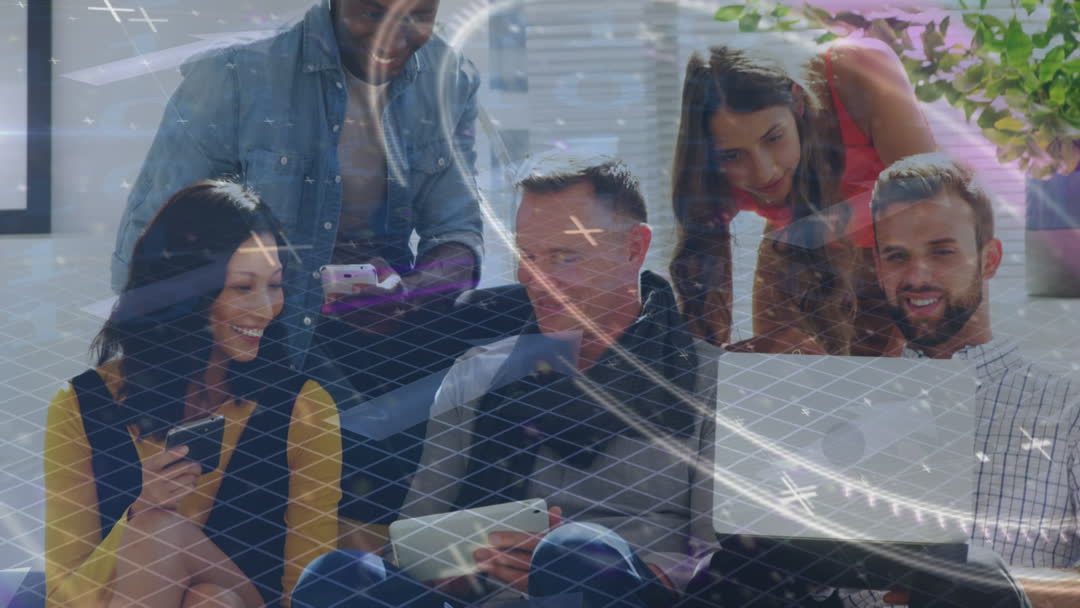 The video features a diverse group of business professionals engaged in a collaborative session with electronic devices. Overlaid data visualizations suggest an innovative, tech-driven environment. Suitable for promoting team collaboration, showcasing modern business technology strategies, or illustrating connectivity in a global business context.