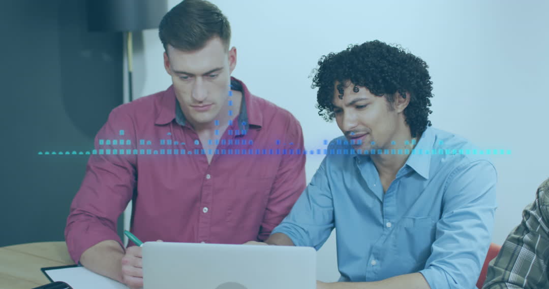 Diverse Team Collaborating on Digital Project with Data Overlay Video