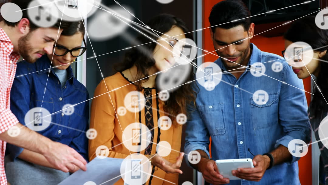 Diverse group of colleagues gathered around digital tablet discussing innovative concepts in a modern office setting. Visual elements of network icons suggest themes of connectivity and digital communication. Suitable for illustrating teamwork and collaboration, technology-driven business innovation, or global networking strategies.