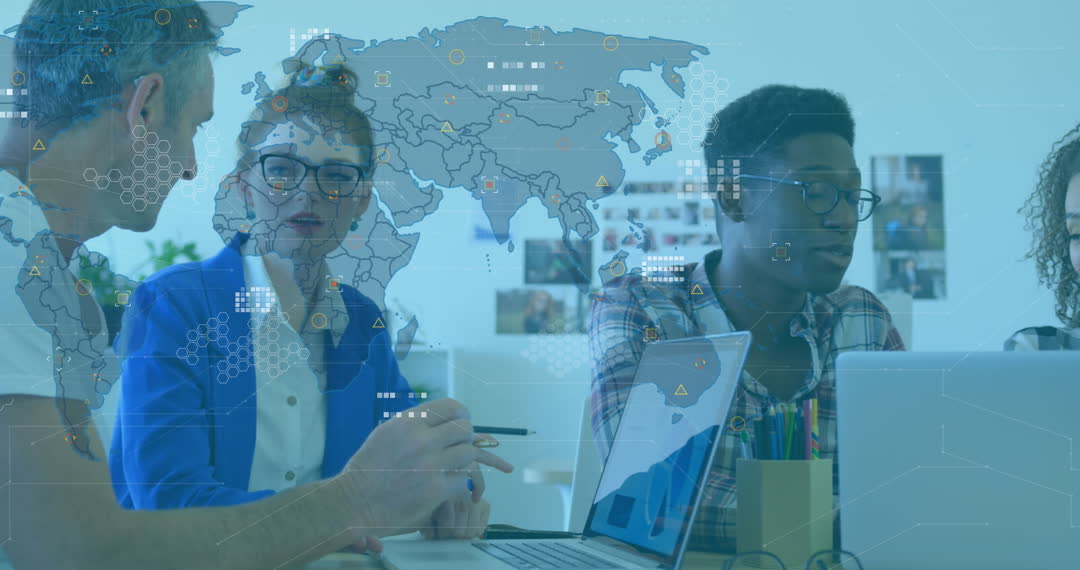 This video features a diverse group of coworkers engaging in a collaborative discussion with an overlay of a world map and digital graphics, emphasizing global communication and teamwork in tech. Ideal for use in articles about multicultural collaboration, modern business environments, and technology-driven workplaces.