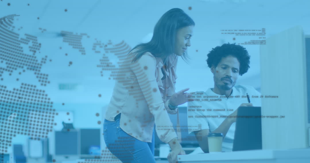 Two diverse professionals collaborating in a modern office environment with a digital interface displaying financial data and a globe overlay. Ideal for illustrating concepts such as teamwork in technology, global market analysis, and modern financial operations. Suitable for business and tech blogs, corporate websites, or project management presentations.