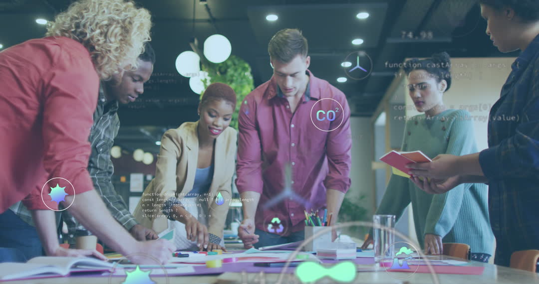 - Diverse Team Collaborating on Innovative Project with Tech Overlay