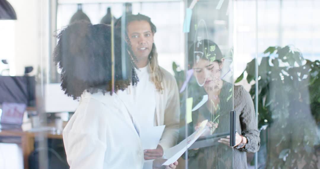 Individuals working together using a glass wall for drawing and taking notes during a team meeting in an office. Great for showcasing modern office teamwork, diversity in business environments, and innovative collaboration methods.