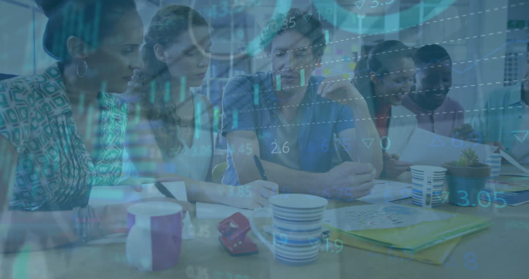 Group of professionals engaged in collaborative work, interpreting financial data within a modern office environment. Ideal for highlighting the themes of teamwork, diverse work culture, and data-driven business strategies. Useful for articles or presentations focusing on global finance, teamwork principles, or modern work environments.
