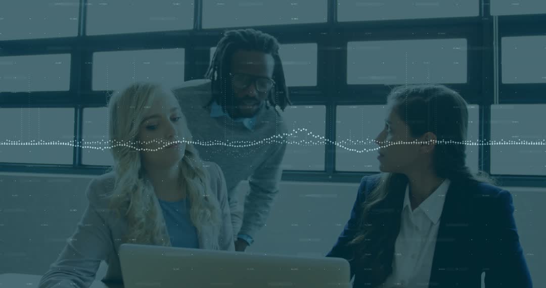 Diverse Team Collaborating Over Laptop With Data Visualization Overlay Video