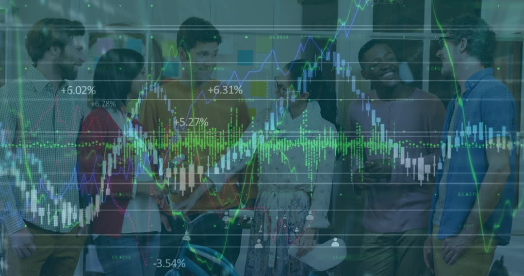 Diverse group of colleagues interacting in modern office environment with financial data and stock market chart overlay. Symbolizes collaborative business planning and teamwork in finance sector. Ideal for use in articles about business strategy, diversity in workplaces, and financial technology solutions.