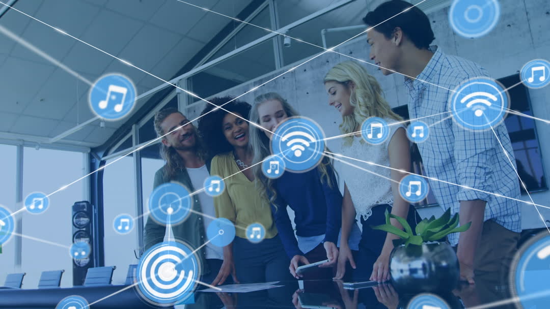 A group of diverse business people gather around a table in a modern office, focusing on work together. Superimposed digital icons of connections and devices suggest digital transformation and multimedia networking. Useful for illustrating teamwork, innovative tech industries, and collaboration dynamics in a globally connected world.