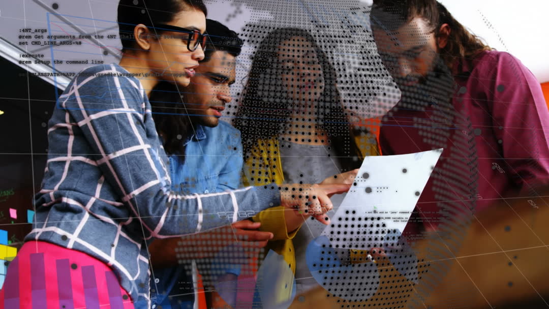 Four diverse business people collaborate around a document with a digital interface overlay highlighting a global concept. The video portrays the fusion of technology and teamwork in a professional setting, ideal for presentations about innovation, global business strategies, or team collaboration in modern workspaces.