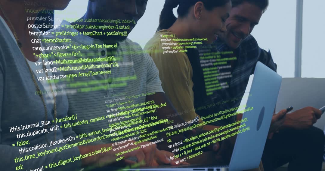 - Diverse Team Collaborating with Transparent Code Overlay for Startup Project