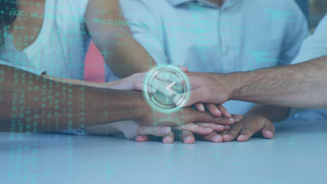 Several diverse business people are uniting their hands in a circle, with transparent digital and clock graphics superimposed. This conveys themes of teamwork, time management, technological integration, and a digital enterprise environment. It is suitable for depicting ideas of global collaboration, innovative business solutions, or concepts focusing on corporate unity and efficiency. Perfect for illustrating business articles, digital tech reports, or team-building marketing materials.