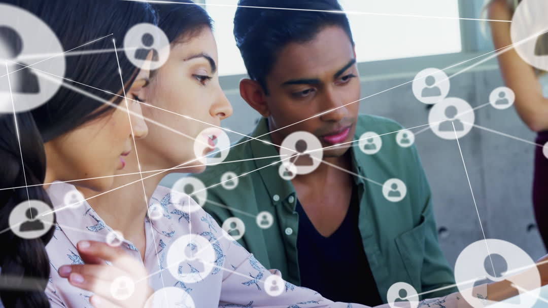 A diverse group of young professionals collaborates on a tablet, surrounded by digital connection symbols overlaid on the setting. This conveys themes of teamwork, global networking, and interconnectedness in a modern business environment. Suitable for illustrating concepts related to technology-driven collaboration, digital communication in the workplace, or promoting global cross-cultural teamwork.