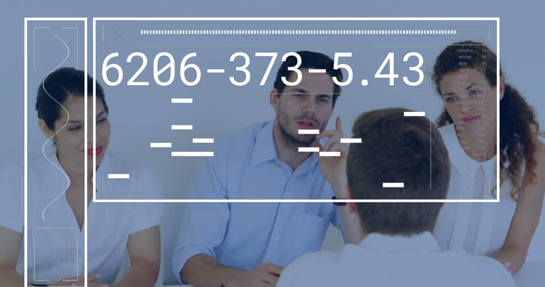 Scene of diverse coworkers engaged in evaluating a strategic idea at a business meeting. Contains overlaid numbers and graphs, symbolizing data analysis and decision-making. Useful for illustrating themes around team collaboration, problem-solving, and workplace challenges.