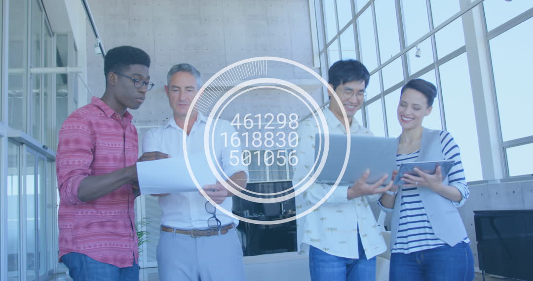 Perfect for use in business and technology themes, corporate presentations, or diversity and teamwork promotions, highlighting professional collaboration and modern office environments. Useful for showcasing how diverse teams come together in a technological workspace.