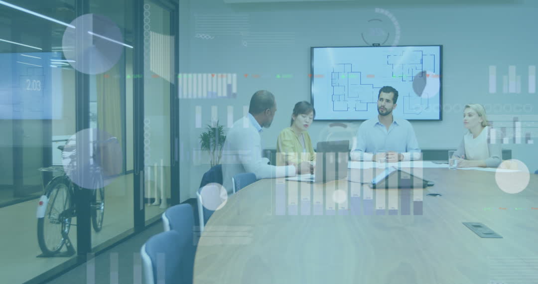 A multi-ethnic team of colleagues is sitting in a modern conference room, surrounded by digital overlays of statistical data and technology graphics. They are engaged in a strategic discussion aimed at analyzing and optimizing business strategies. Use this video to illustrate concepts related to teamwork, modern business technology, data analysis, and collaborative planning in professional settings.
