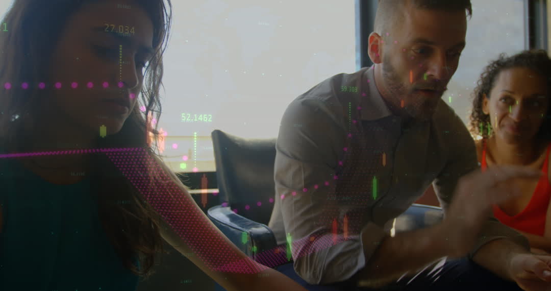 Business professionals are engaged in a discussion, focused on financial data displayed as digital overlay graphics. These elements highlight modern data analysis methods. Useful for representing teamwork in corporate environments, highlighting diversity in business, promotion of innovative technology solutions, or illustrating financial analysis and decision-making processes.