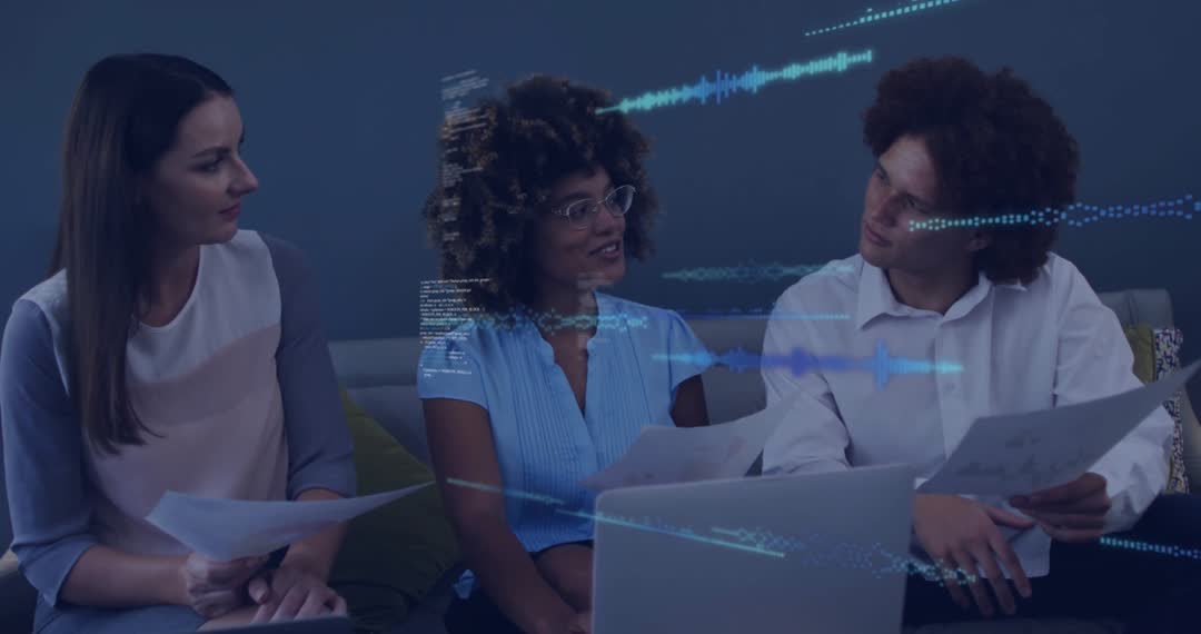 - Diverse Team Discussing Data with Virtual Code Overlays
