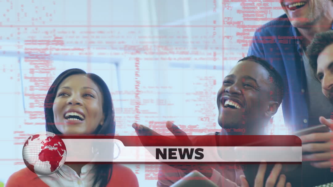 Diverse Team Discussing Digital Content Overlayed with News Graphics Video