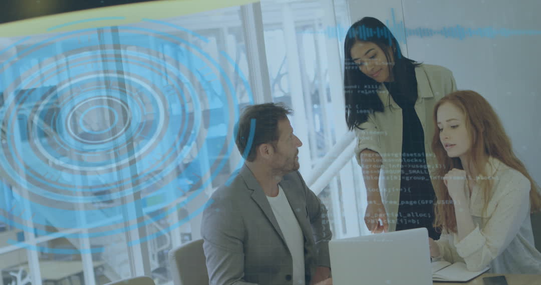 This stock photo captures a diverse team in a corporate environment discussing digital technology and data analysis over a laptop. Code and blueprint elements overlay the scene, emphasizing a high-tech theme. Ideal for illustrating materials about digital transformation, modern business practices, collaboration strategies, and technology-driven workplaces. Suitable for use in blogs, corporate websites, presentations, and marketing materials promoting innovative business solutions.