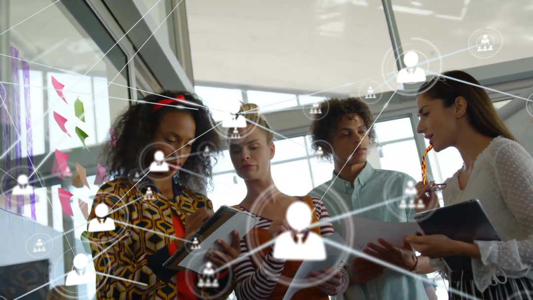 Group of diverse business professionals discussing innovative ideas with digital network overlays. They are collaborating in an office setting, symbolizing modern business communication and technological connectivity. Perfect for illustrating concepts of teamwork, global communication, or the integration of technology in corporate environments. Ideal for business presentations, website banners, or articles on digital innovation.