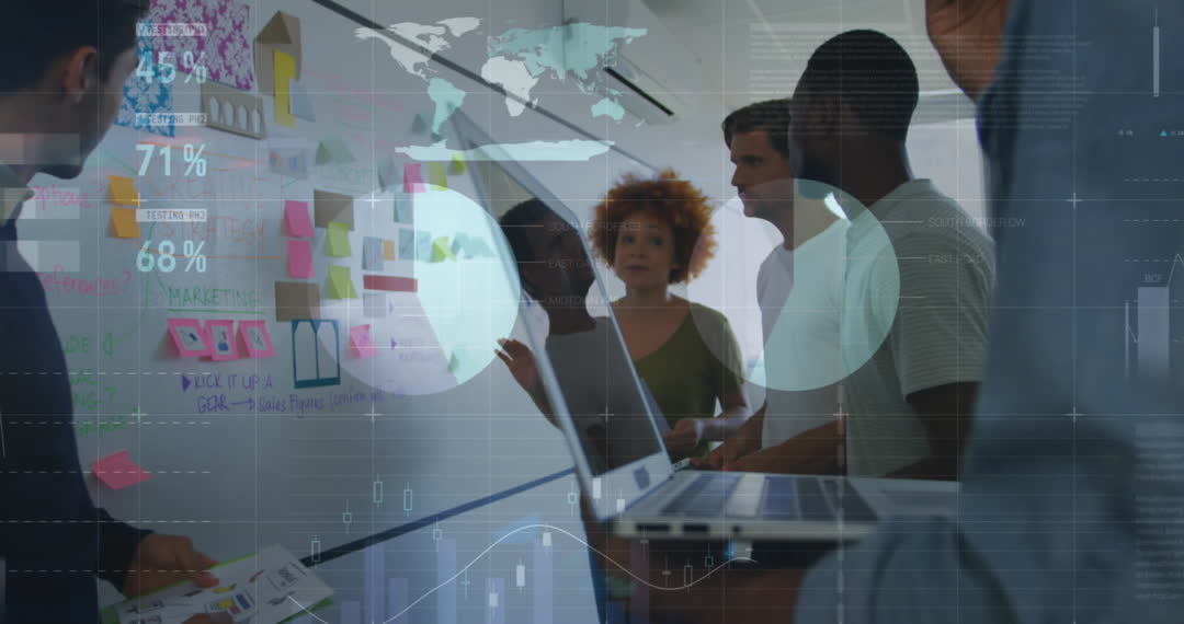 Team of diverse coworkers engaged in strategy discussion around a whiteboard. Multiple exposure includes advanced infographic interface elements, conveying modern business and technological progress. Suitable for content on teamwork, innovation, project planning, and corporate environments, highlighting creativity and global business topics.