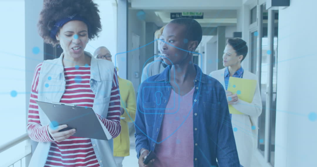 Image features a group of professionals engaging in a lively discussion as they walk through a corridor. Ideal for content related to business collaboration, teamwork ideas, diversity in the workplace, and professional teamwork enhancement. Suitable for use in corporate training materials, diversity promotion campaigns, and articles about modern workforce dynamics.