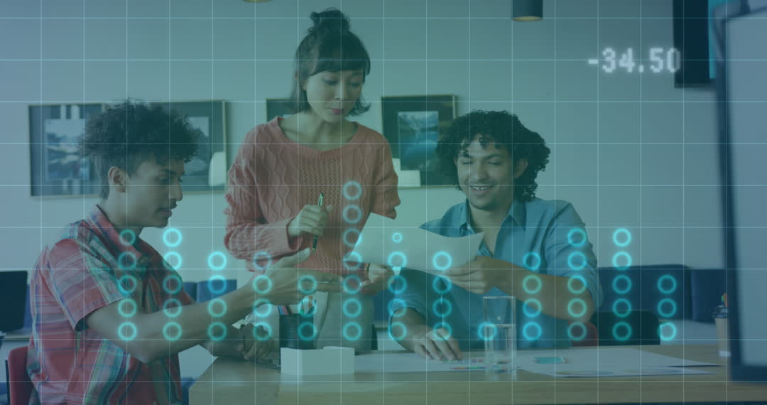 - Diverse Team Discussing Work with Financial Graph Overlay