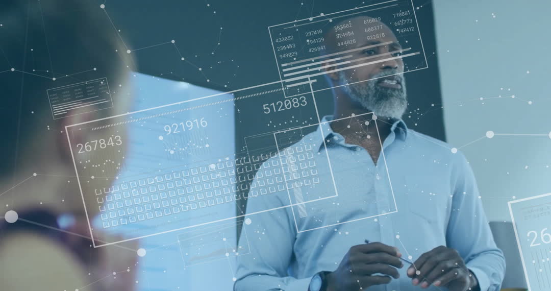 This video captures a diverse group engaged in a business meeting, focusing on digital strategy and data processing. The animated data overlay suggests advanced technology use and modern workplace dynamics. Perfect for illustrating themes of innovation, digital transformation, teamwork, and effective communication in professional settings.