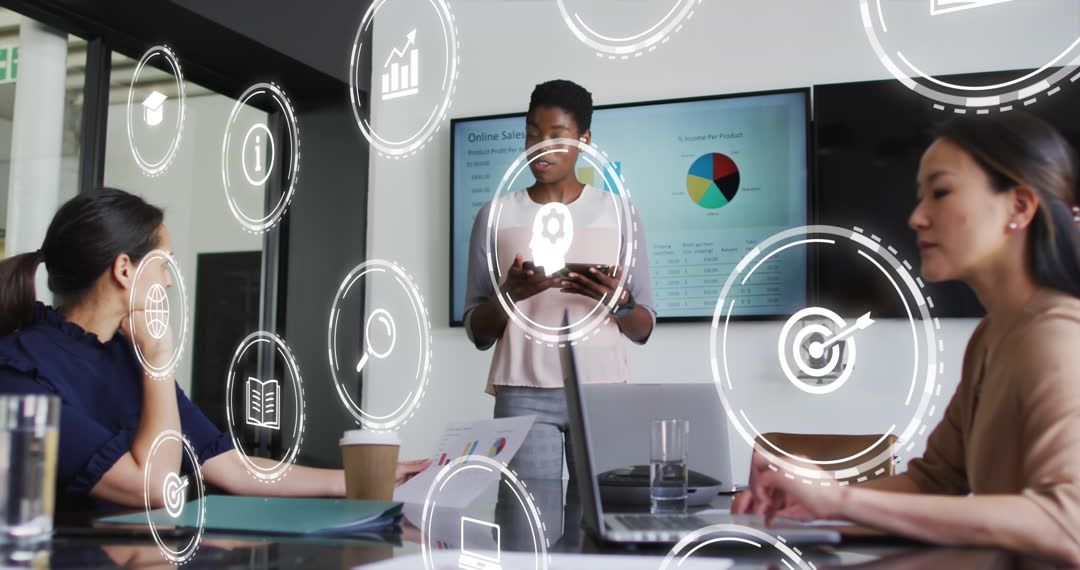 - Diverse Team Engaged in High-tech Business Presentation with Digital Icons