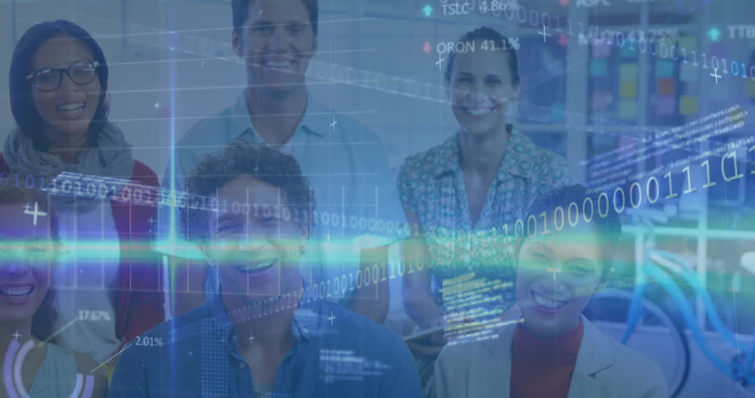 Group of diverse colleagues happily engaging with data processing visuals overlaying a modern office environment, symbolizing innovation in business analytics and digital collaboration. Useful for content about teamwork, tech-driven workspaces, data-focused industries, or corporate diversity initiatives.