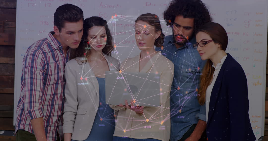 Group of co-workers engaging with digital technology overlay, symbolizing data-driven innovation and collaboration. Ideal for use in articles or advertisements focusing on business solutions, teamwork, digital transformation, or innovative technologies within a corporate environment.