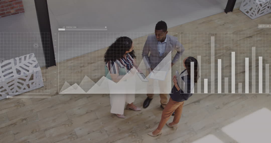 Colleagues in professional attire engaging in a discussion centered on data analytics. Graphs and charts overlayed on scene emphasize a focus on analytics, business intelligence, and strategic planning. Ideal for visuals relating to modern business practices, teamwork, or any promotional content focusing on technology-driven collaborations and diversity in the workplace.