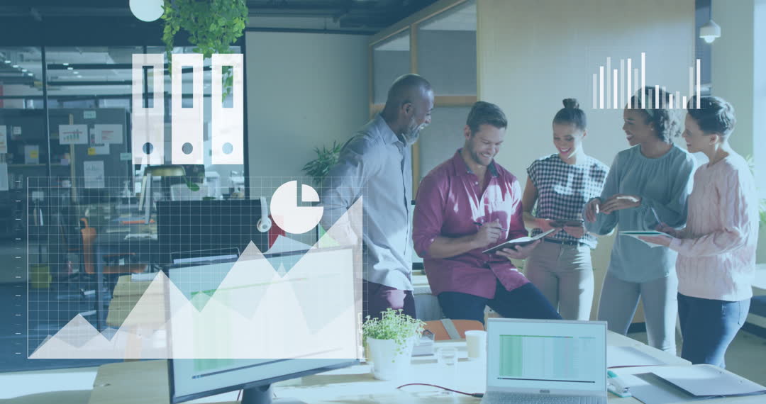 Image depicts diverse colleagues engaged in a modern office meeting with statistical data animations overlaid. Charts and graphs suggest focus on analysis and business growth strategy. Use for illustrating concepts of teamwork, data-driven decision making, and innovation in corporate environments.