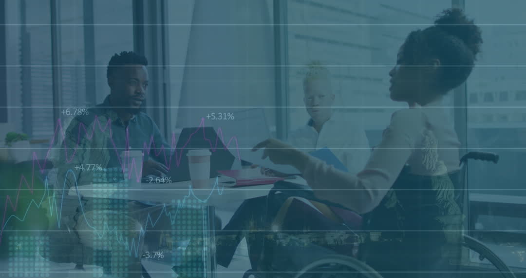 Businesspeople are gathered around a table, actively engaging in a strategic finance meeting that includes a colleague with a disability using a wheelchair. The modern office setting emphasizes inclusion and diversity, with overlay graphics of financial data suggesting technology and innovation. This visual can be used to highlight themes of inclusivity, financial strategies, or collaborative teamwork in corporate environments.