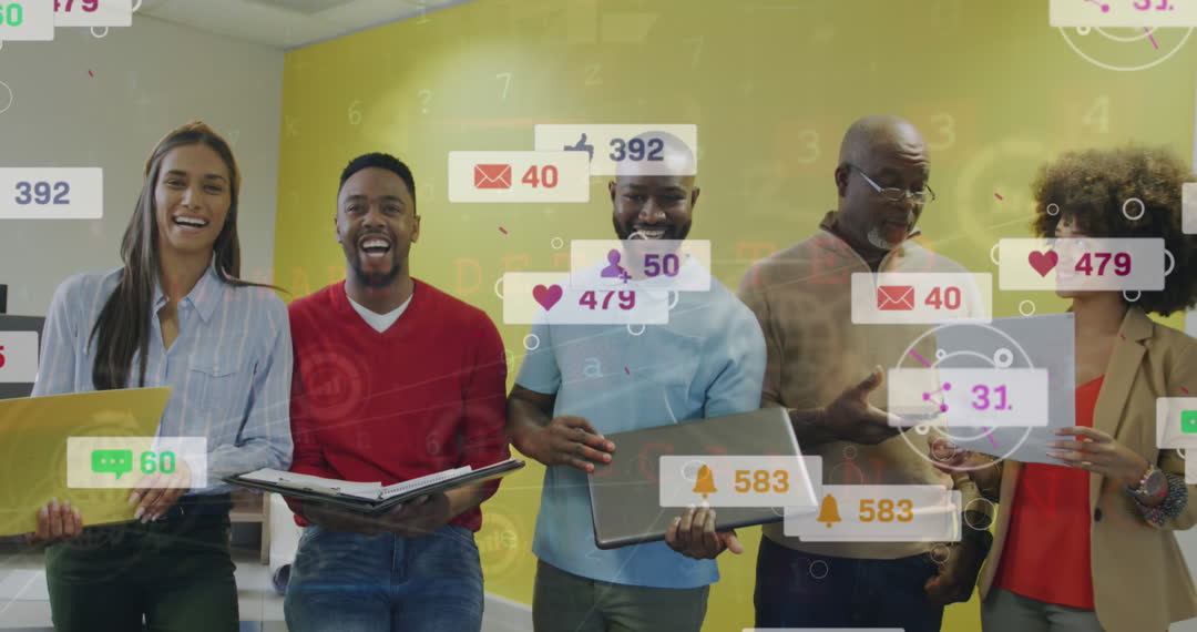Diverse group of coworkers engaged in a lively discussion about social media in an office environment. Overlapping social media notifications emphasize the theme of digital communication and connectivity. Ideal for illustrating concepts related to team collaboration, corporate communication, technology and workplace diversity.