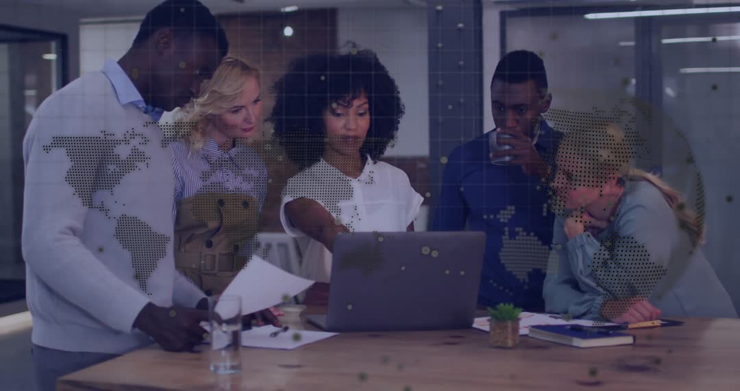 - Diverse Team in Strategy Discussion with Animated World Map Charts