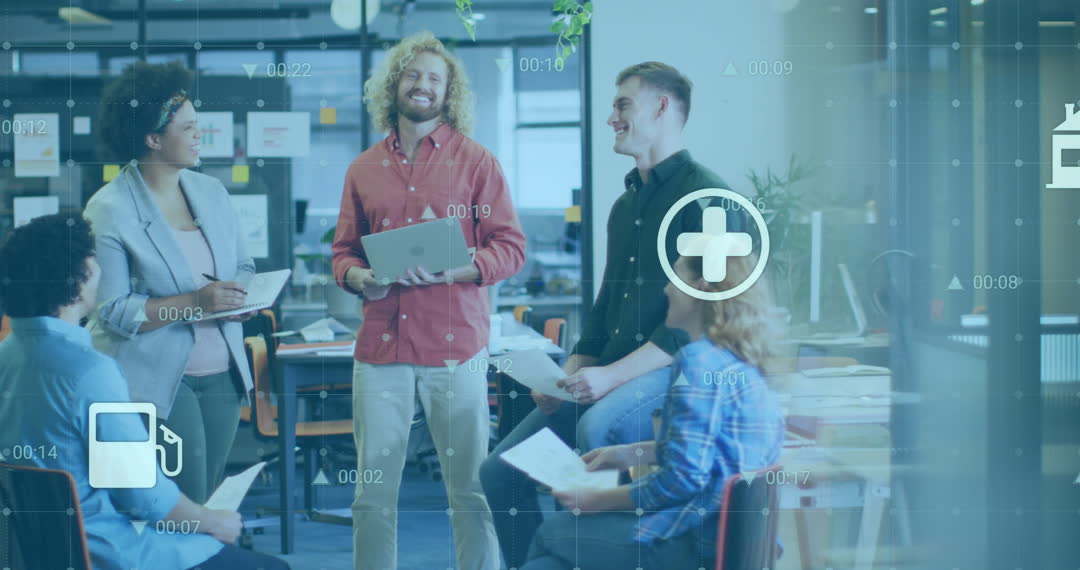 Diverse Team Sharing Ideas with Digital Overlay Elements in Modern Office Video