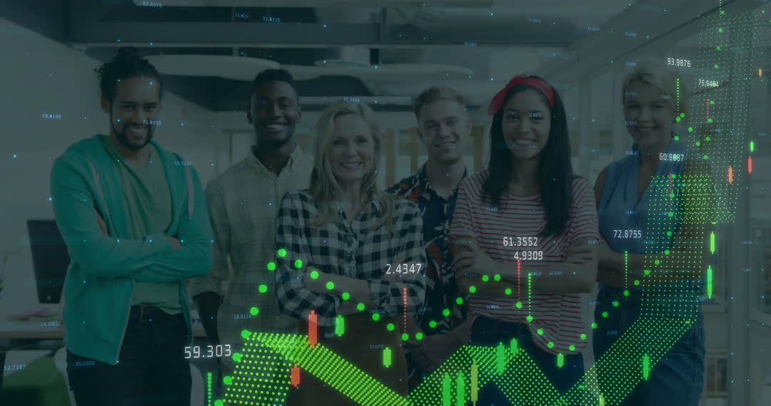 Diverse group of professionals smiling with a stock market chart videory overlay, symbolizing unity in business and finance sectors. Ideal for depicting modern workplace diversity and analytics in action.