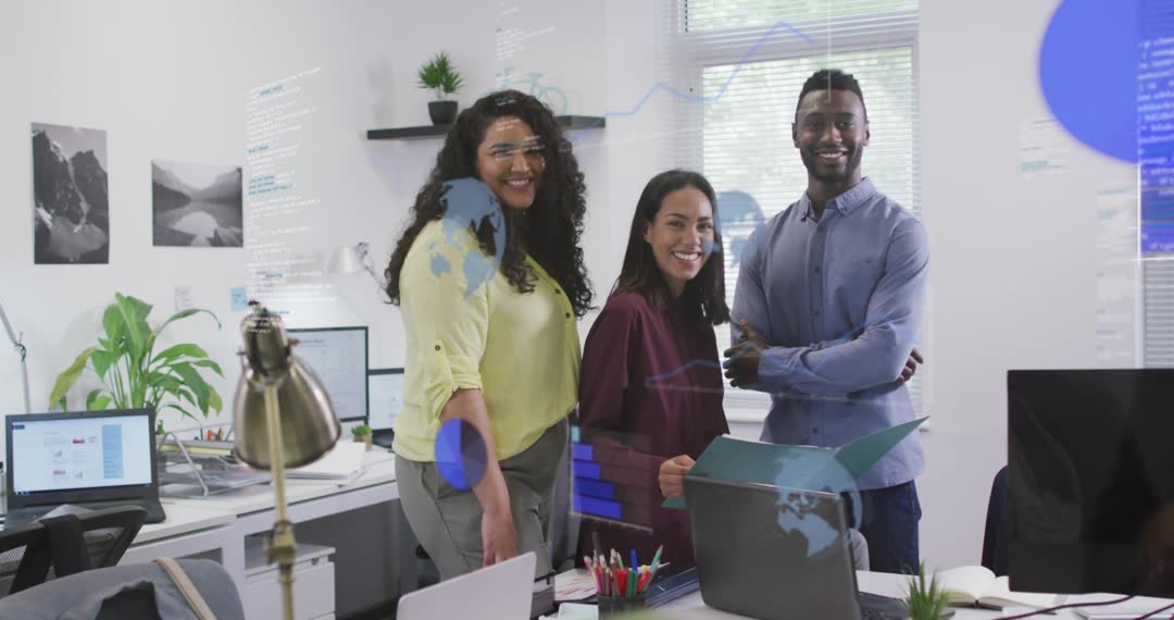 Dynamic video depicting a diverse group of professionals standing in modern office while animated financial data charts overlay becomes visible. Suitable for showcasing teamwork, business productivity, innovation, and integrating data into daily operations. Ideal for corporate presentations, financial technology promotions, or enhancing multimedia projects stressing diversity and collaboration in workplace.