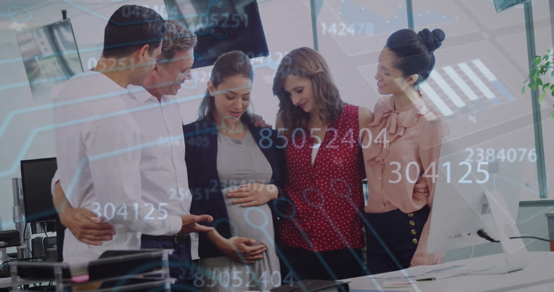 - Diverse Team Supporting Pregnant Colleague with Data Overlay