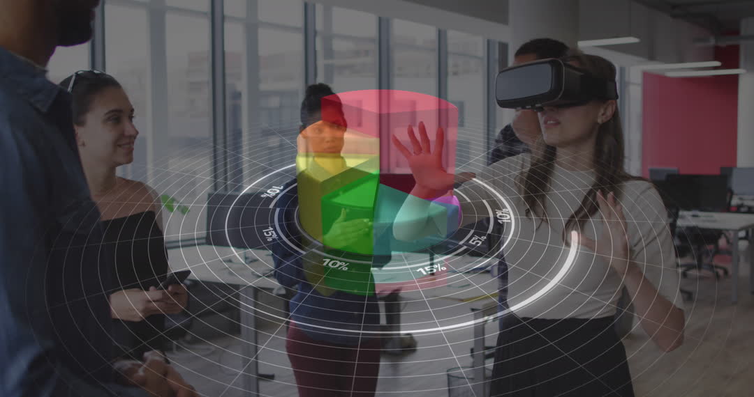 Diverse group is engaging with augmented reality technology in a modern office environment. Augmented reality overlay displays interactive 3D pie charts used for financial analysis. Suitable for illustrating innovative business solutions, digital transformation in corporate settings, tech-driven teamwork, and modern data processing techniques applicable in presentations, blogs, and articles about future workspaces.